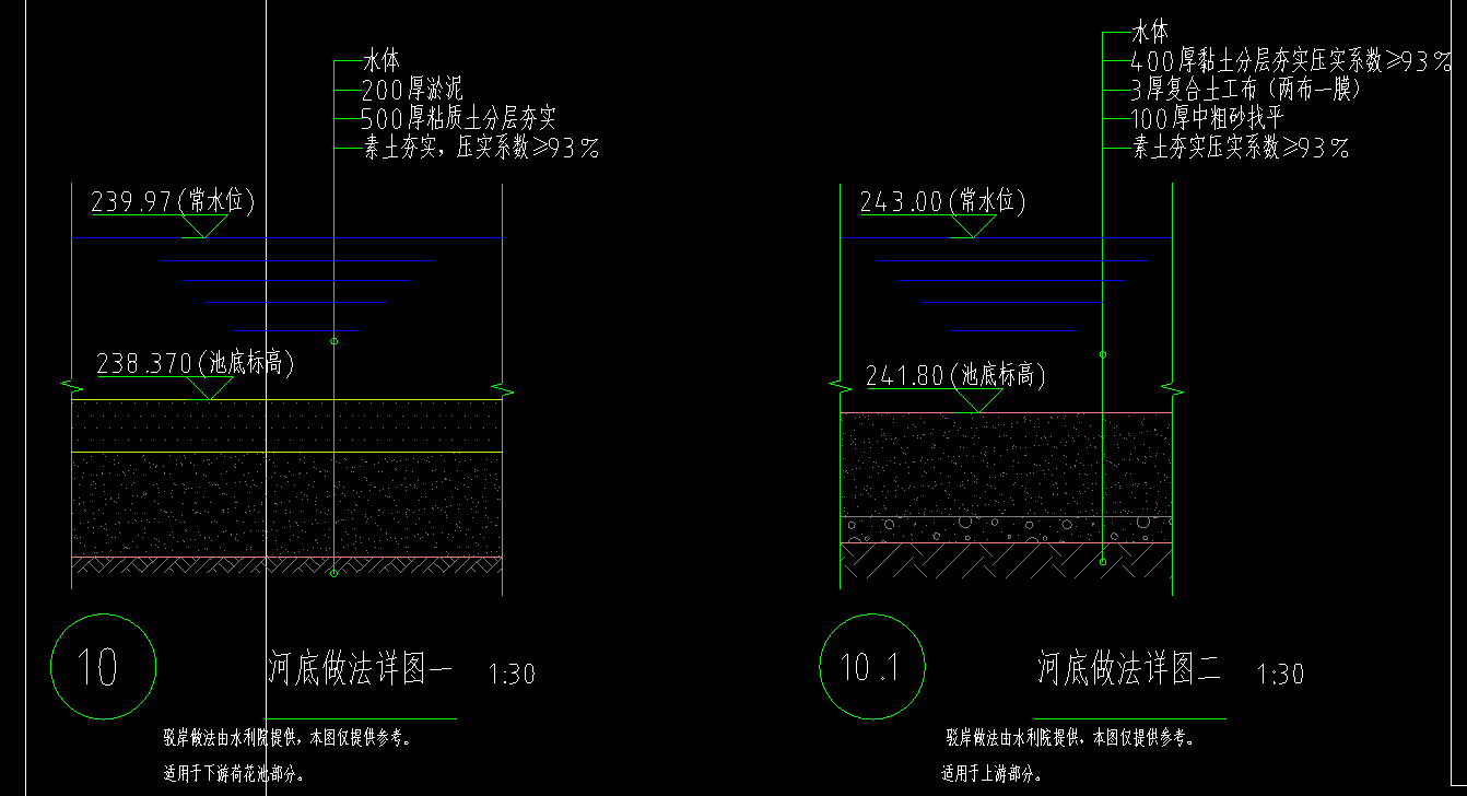 一、图纸设计:河道池底做法为200厚淤泥,500厚粘质土,素土夯实;